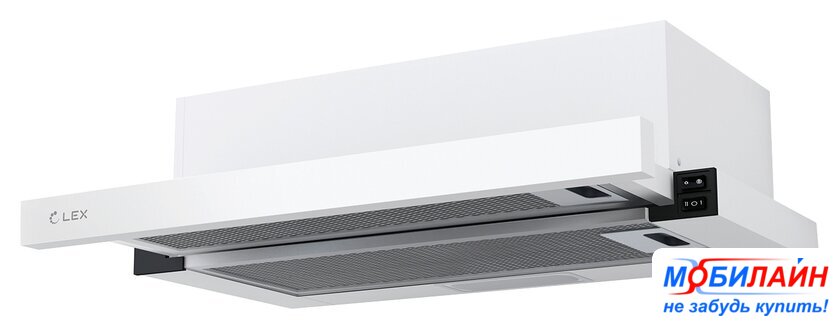 конструкция телескопическая, монтаж для встраивания, ширина 59.8 см, управление механическое/кнопочное, производительность мотора 670 м³/ч, цвет белый