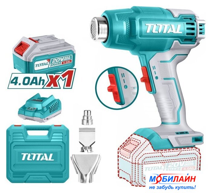 | Комплект поставки | - Термовоздуходувка - 1 шт.- Аккумулятор 4,0 Ач - 1 шт.- Зарядное устройство 2 А - 1 шт.- Насадка - 3 шт.- Кейс |