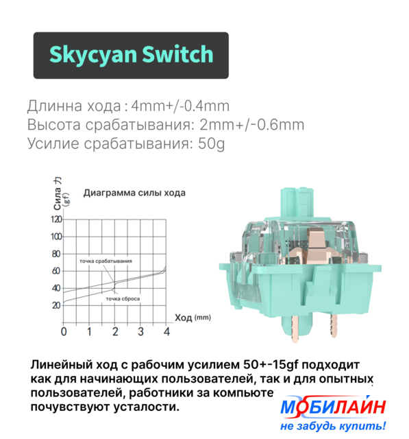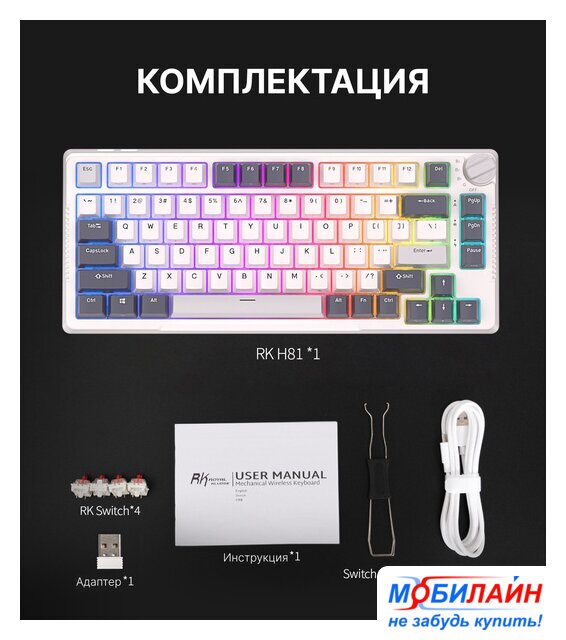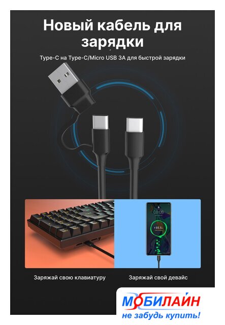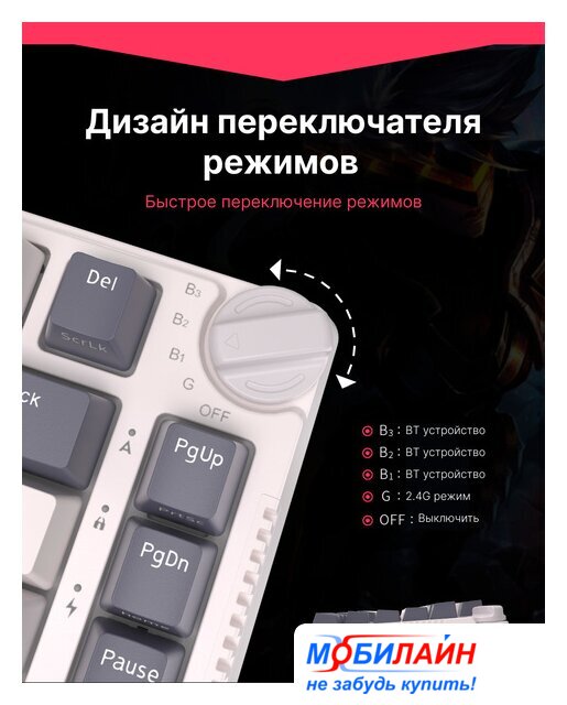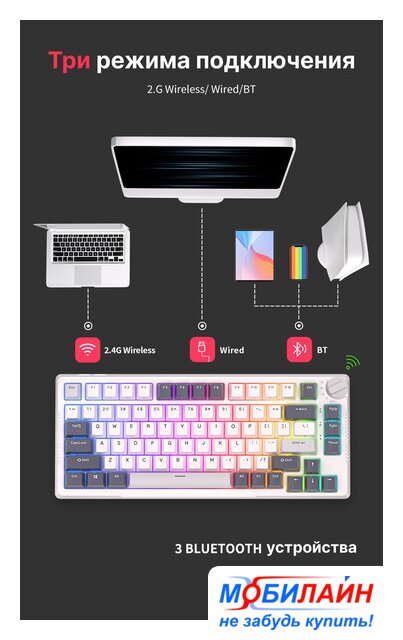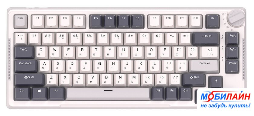игровая для ПК/для компьютеров Apple, механическая, Outemu Brown, ход тактильный/тихие, пластик, интерфейс подключения - USB-A/радио/Bluetooth, подсветка, кириллица: да, цвет белый/темно-синий