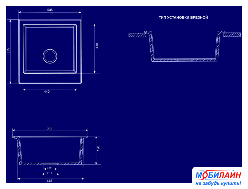 врезная на столешницу, искусственный камень, размеры: 50.5x51.5 см