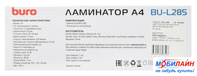 пакетный, A4, нагревательный элемент: валы, скорость: 30 см/мин, время нагрева: 2 мин, 230×60×110 мм, 0.82 кг