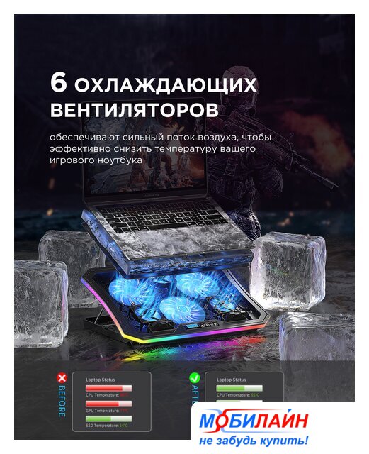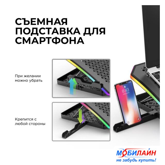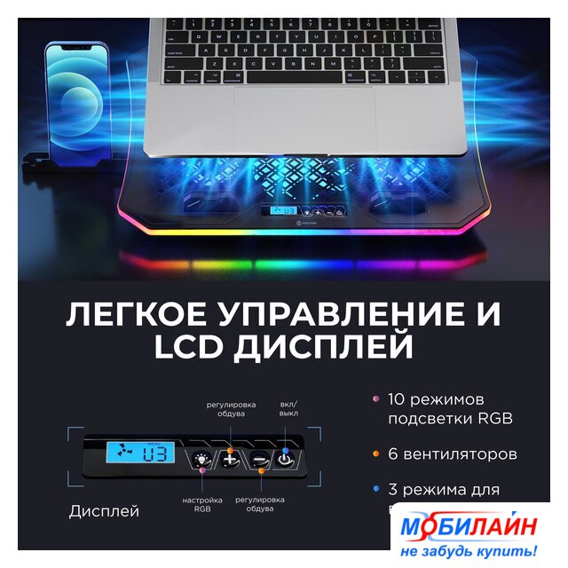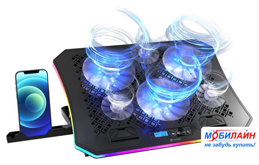 Особенности | - встроенный ЖК-дисплей- 10 режимов RGB-подсветки- съемная подставка для смартфона- регулировка скорости больших вентиляторов в диапазоне от 1000 до 1300 об/мин- регулировка скорости маленьких вентиляторов в диапазоне от 1800 до 2100 об/мин- воздушный поток 63-85 CFM- минимальный уровень шума 21 дБ- максимальный уровень шума 26 дБ |