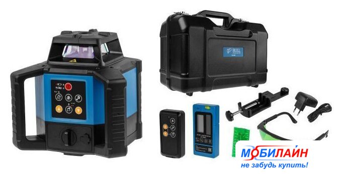 Комплект поставки | - Нивелир лазерный ротационный (1 шт.);- Элементы питания 3.7 В, 10 000 мА*ч;- Пластиковый кейс (1 шт.);- Зарядный кабель USB Type-C 5 В, 2000 мА;- Пульт дистанционного управления (1 шт.);- Мишень (зелёная) (1 шт.);- Приемник лазерного излучения BULL LR 10000 (1 шт.);- Очки для наблюдения за лазерным лучом (зелёные) (1 пара);- Инструкция по эксплуатации (1 шт.);- Переходник с 5/8" на 1/4"; |