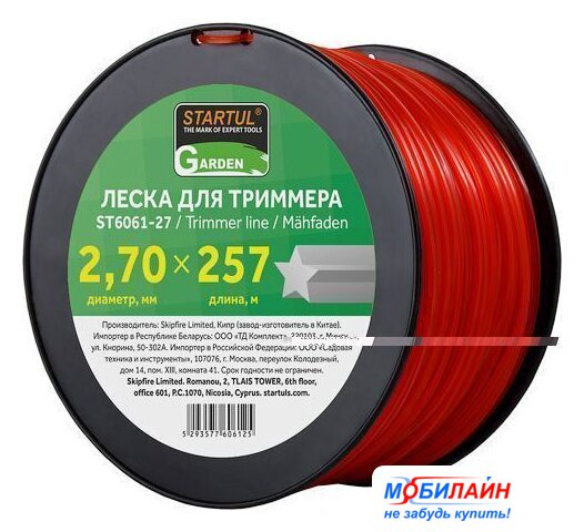 применение: для газонной травы, материал: нейлон, тип сечения лески: квадрат, диаметр лески 2.7 мм, длина лески 197 м, цвет: красный