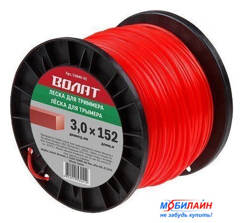 применение: для газонной травы, тип сечения лески: шестигранный, диаметр лески 3 мм, длина лески 167 м, цвет: красный