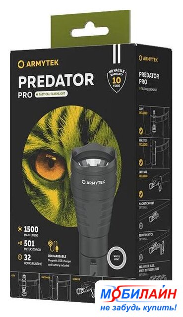 Комплект поставки | - фонарь;- аккумулятор 18650;- быстрая магнитная USB-зарядка;- стальная клипса;- ремешок на руку;- нейлоновый чехол;- силиконовый грип-упор;- два запасных уплотнительных кольца;- инструкция. |