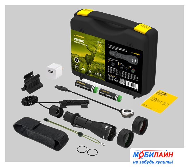 Комплект поставки | - Фонарь (Armytek Viking Pro Magnet USB);- 2 аккумулятора 18650 Li-Ion 3500 мАч;- 2 цветных фильтра (красный, зеленый);- Магнитная выносная кнопка MRS-01 с креплением и липучкой фиксации;- Магнитное подствольное крепление AWM-03;- Сетевой адаптер;- Стальная клипса;- Магнитное зарядное устройство AMC-03;- Ремешок на руку из паракорда;- Нейлоновый чехол;- Силиконовый грип-упор;- 2 запасных уплотнительных кольца;- Инструкция. |