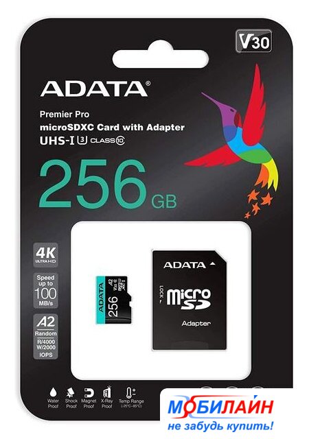 256 Гб, класс 10, UHS-I (класс U3), V30, A1, чтение: 100 МБ/с, адаптер