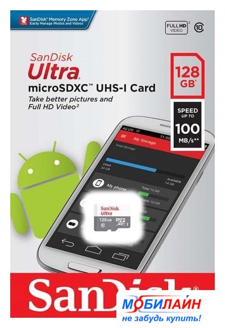 128 ГБ, класс 10, UHS-I (класс U1), чтение: 100 МБ/с, запись: 10 МБ/с, адаптер