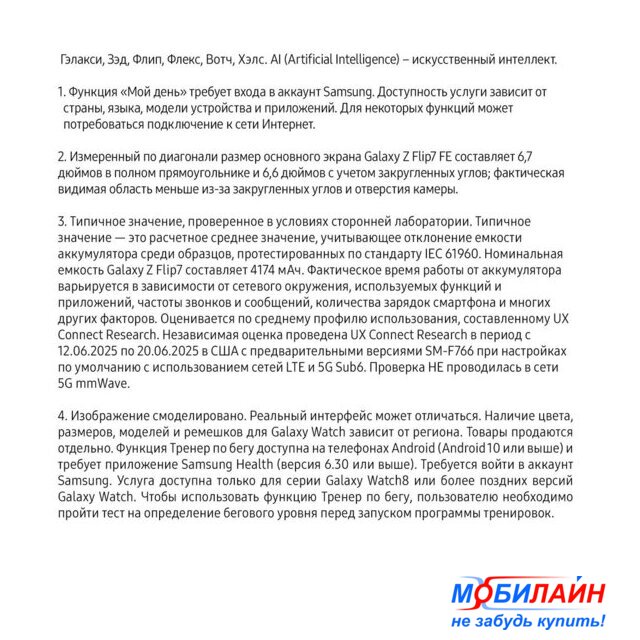 Отличия от предыдущего поколения | ✅ Galaxy Z Flip7 получил увеличенный внешний экран FlexWindow размером 4,1 дюйма с частотой обновления 120 Гц и яркостью до 2600 нит, что позволяет использовать множество функций без необходимости раскрывать устройство. Основной внутренний дисплей также увеличился до 6,9 дюйма, обеспечивая более комфортное взаимодействие с контентом. Кроме того, устройство стало тоньше и легче, что улучшает его портативность и удобство использования.✅ В отличие от Z Flip6, который оснащался процессором Snapdragon 8 Gen 3, новый Z Flip7 работает на базе 10-ядерного чипсета Exynos 2500, выполненного по 3-нм техпроцессу, что обеспечивает улучшенную производительность и энергоэффективность.✅ Внешний экран Galaxy Z Flip7 имеет более тонкие рамки, самые тонким в серии Galaxy Z Flip. Такая конструкция от края до края создает ощущение безграничного экрана, что делает его еще более удобным для использования в сложенном состоянии. В раскрытом виде это наш самый тонкий Flip, что ставит его в один ряд с любым другим смартфоном. Размер основного экрана увеличился до 6,9 дюйма, а соотношение сторон составляет 21:9, что обеспечивает более разнообразное использование. |