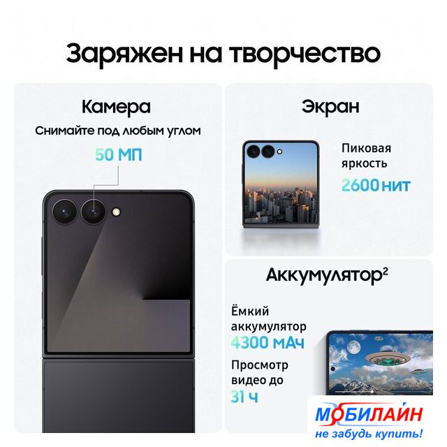 Отличия от предыдущего поколения | ✅ Galaxy Z Flip7 получил увеличенный внешний экран FlexWindow размером 4,1 дюйма с частотой обновления 120 Гц и яркостью до 2600 нит, что позволяет использовать множество функций без необходимости раскрывать устройство. Основной внутренний дисплей также увеличился до 6,9 дюйма, обеспечивая более комфортное взаимодействие с контентом. Кроме того, устройство стало тоньше и легче, что улучшает его портативность и удобство использования.✅ В отличие от Z Flip6, который оснащался процессором Snapdragon 8 Gen 3, новый Z Flip7 работает на базе 10-ядерного чипсета Exynos 2500, выполненного по 3-нм техпроцессу, что обеспечивает улучшенную производительность и энергоэффективность.✅ Внешний экран Galaxy Z Flip7 имеет более тонкие рамки, самые тонким в серии Galaxy Z Flip. Такая конструкция от края до края создает ощущение безграничного экрана, что делает его еще более удобным для использования в сложенном состоянии. В раскрытом виде это наш самый тонкий Flip, что ставит его в один ряд с любым другим смартфоном. Размер основного экрана увеличился до 6,9 дюйма, а соотношение сторон составляет 21:9, что обеспечивает более разнообразное использование. |
