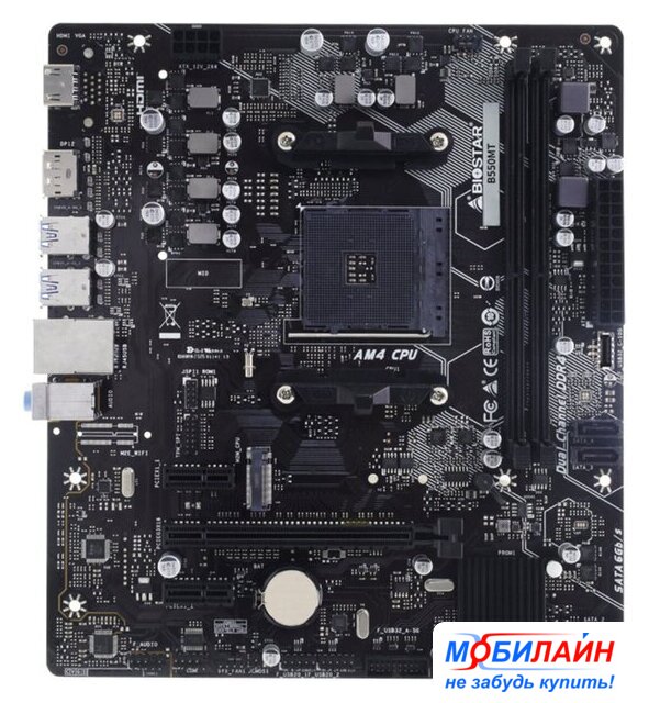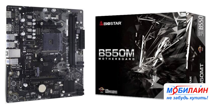 mATX, сокет AMD AM4, чипсет AMD B550, память 2xDDR4 до 4733 МГц, слоты: 1xPCIe x16 4.0, 1xPCIe x1, 1xM.2