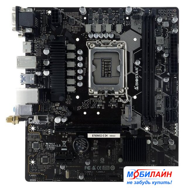 mATX, сокет Intel LGA1700, чипсет Intel B760, память 2xDDR4 до 5333 МГц, слоты: 1xPCIe x16 4.0, 2xPCIe x1, 2xM.2