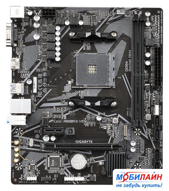 mATX, сокет AMD AM4, чипсет AMD A520, память 2xDDR4, слоты: 1xPCIe x16, 2xPCIe x1, 1xM.2