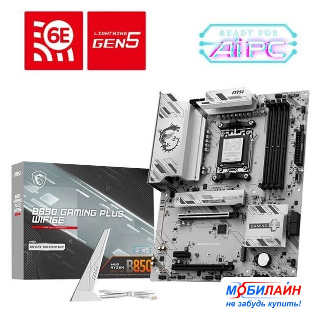 mATX, чипсет AMD B850, память 4xDDR5 до 8000 МГц, слоты: 1xPCIe x16 5.0, 1xPCIe x4, 3xM.2, 802.11ax (Wi-Fi 6E)+Bluetooth 5.2, 8+2+1 фаз питания