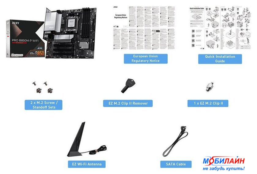 Комплектация | - 2 винта для M.2- EZ M.2 Clip II экстрактор- винт EZ M.2 Clip II- кабель SATA- EZ Wi-Fi антенна - документация |