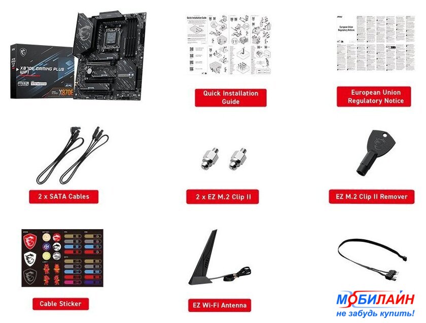 Комплектация | - два кабеля SATA- 2 винта EZ M.2 Clip II- EZ M.2 Clip II экстрактор- набор стикеров- EZ Wi-Fi антенна - 1-2 EZ кабель - документация |