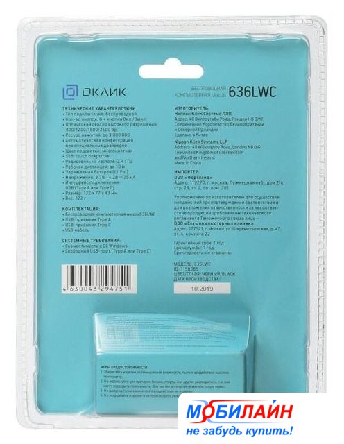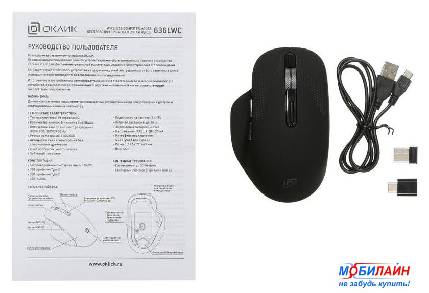 | Комплектация | Беспроводная компьютерная мышь 636LWC;USB-ресивер Type A;USB-ресивер Type C;USB-кабель для зарядки. |
