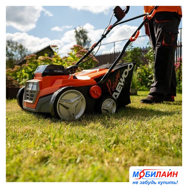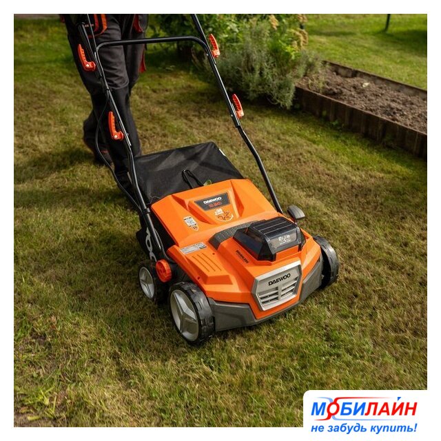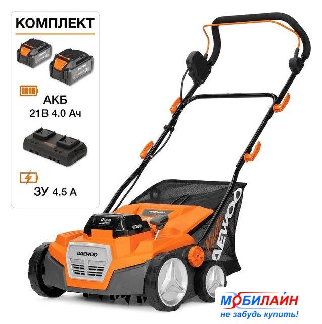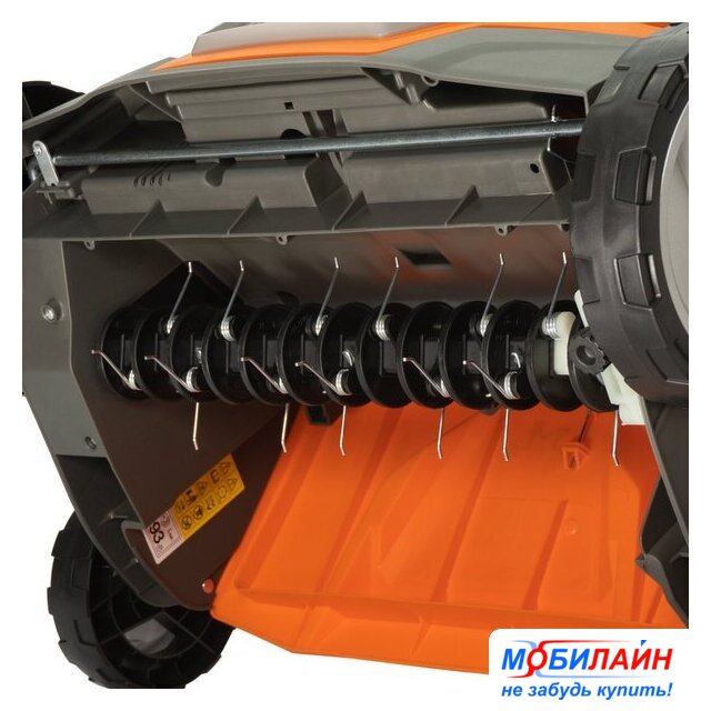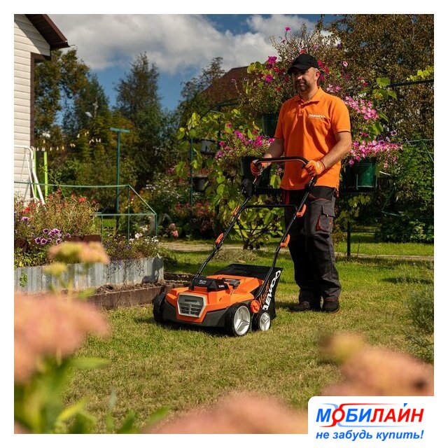 скарификатор-аэратор, аккумуляторный двигатель, ширина скашивания: 35 см, мягкий травосборник 55 л, корпус: пластик