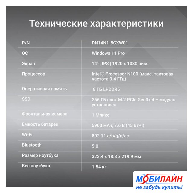 14.0" 1920 x 1080, IPS, 60 Гц, Intel Processor N100, 8 ГБ LPDDR5, SSD 256 ГБ, видеокарта встроенная, Windows 11 Pro, цвет крышки черный, аккумулятор 45.6 Вт·ч