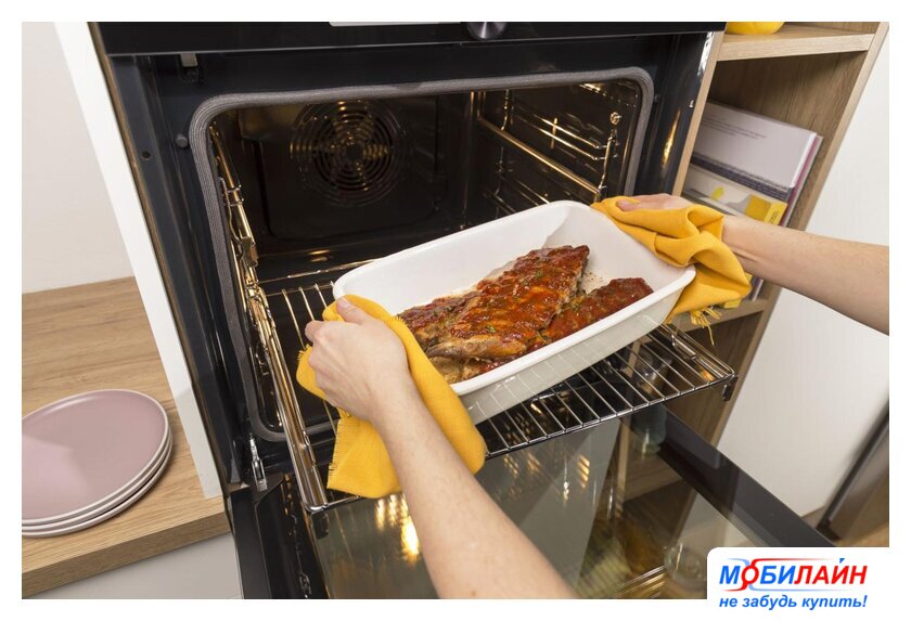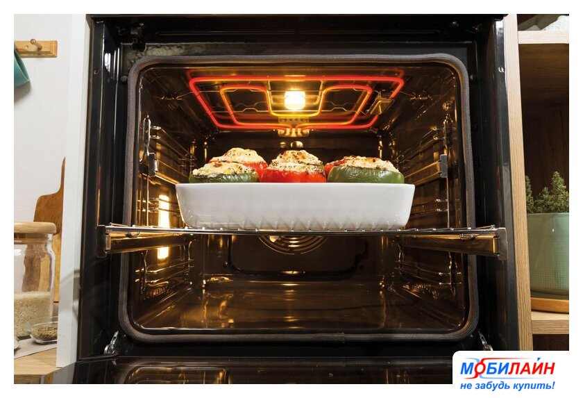 электрический с конвекцией, объем 77 л, 9 режимов, очистка пиролитическая + паровая, 2 стекла в дверце, направляющие проволочные