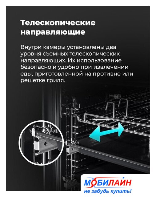 электрический с конвекцией, объем 60 л, 8 режимов, очистка ручная, проволочные направляющие, телескопические направляющие, энергопотребление A