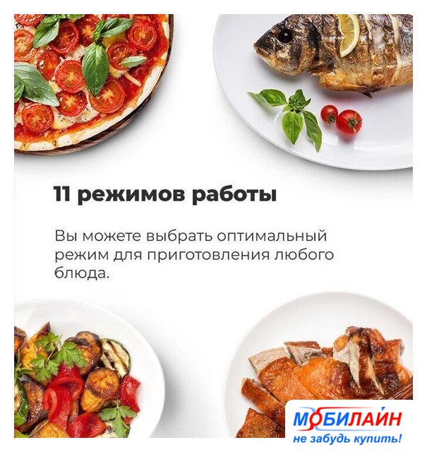 Режимы работы | нижний нагрев, двухсторонний нагрев, большой гриль, вентиляционный нагрев, гриль + конвекция, нижний + вентиляционный нагрев, двухсторонний нагрев + конвекция, размораживание, предварительный разогрев духовки, подготовка теста |