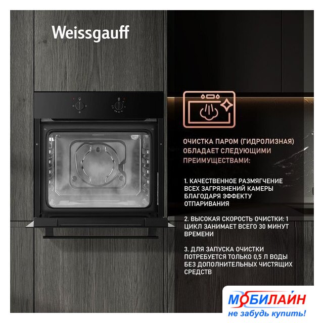 электрический с конвекцией, объем 52 л, утапливаемые переключатели, 7 режимов, очистка паровая, 2 стекла в дверце, направляющие проволочные