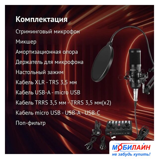 Полная комплектация набора | - Микрофон проводной SM-600G; - Микшер;- Амортизационная опора;- Держатель для микрофона;- Настольный зажим;- Кабель XLR - TRS 3,5 мм;- Кабель USB-A - micro USB;- Кабель TRRS 3,5 мм - TRRS 3,5 мм (х2);- Кабель micro USB - USB-A - USB-С;- Поп-фильтр; |
