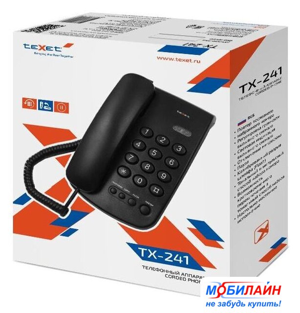 Комплектация | - Телефонный аппарат ТX-241 (в составе корпуса и трубки с витым шнуром);- Линейный шнур;- Руководство по эксплуатации. |