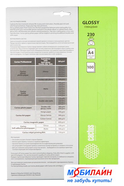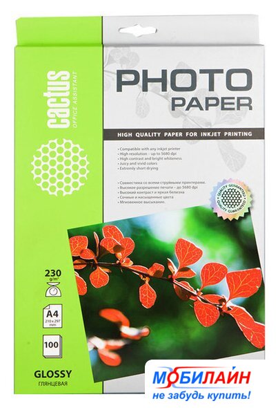 глянцевая фотобумага, плотность 220 г/кв.м., A4, двухсторонняя, струйная печать, 50 листов