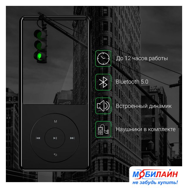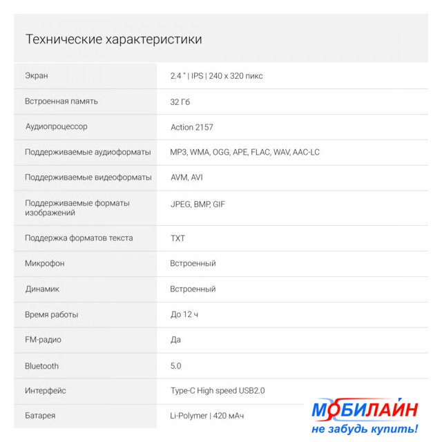 экран 2.4" IPS 240 x 320, поддержка карт памяти, динамик, радио, BT, время работы 1 сутки 16 часов
