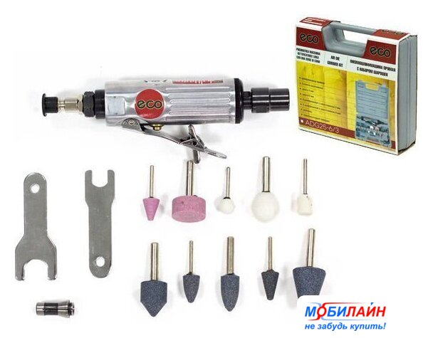 Комплект поставки | 2 гаечных ключа цанговые патроны на 3 мм и 6 мм 5 шлифкамней на 3мм 5 шлифкамней на 6мм нипель чемодан пластиковый |
