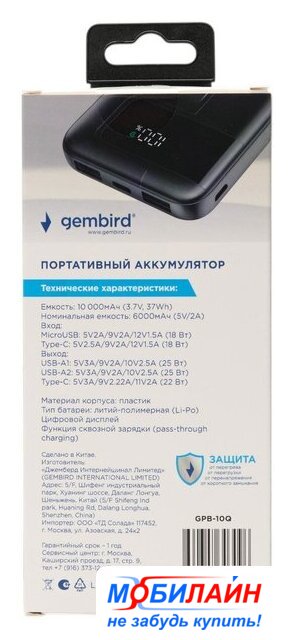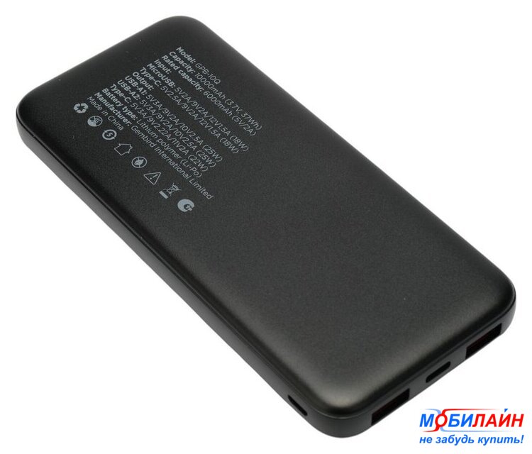 10000 мА·ч (37 Вт·ч), выходы: 3 x 5V/9V/12V (3000 мА), быстрая зарядка