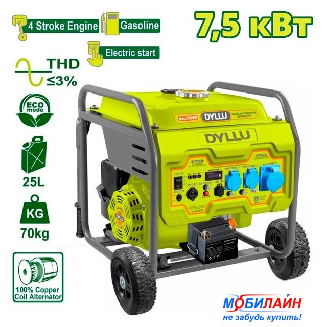 бензиновый, исполнение: открытое, 7.5 кВт, запуск: ручной/электростартер, время непрерывной работы: 8 ч, 92 кг