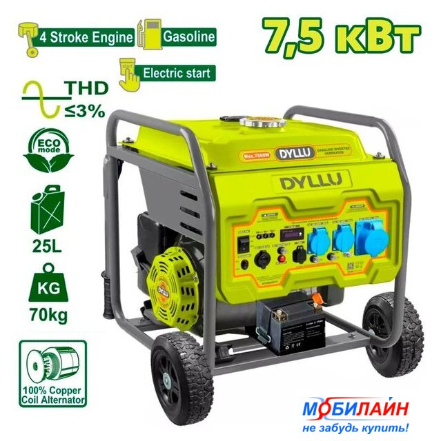 бензиновый, исполнение: открытое, 7.5 кВт, запуск: ручной/электростартер, время непрерывной работы: 8 ч, 92 кг