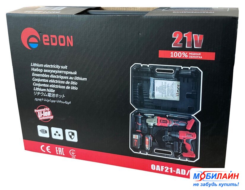 Комплектация | 1. УШМ Edon OAF21-AG - 1 шт.2. Дрель-шуруповерт Edon OAF21-AD - 1 шт.3. Аккумулятор литий-ионный Edon LIO/OAF-3,0A∙h - 1 шт.4. Аккумулятор литий-ионный Edon LIO/OAF-2,0A∙h - 1 шт.5. Зарядное устройство Edon OAF21-1100CB - 1 шт.6. Боковая ручка ушм - 1 шт.7. Ключ для замены диска - 1 шт.8. Поясное крепление (крючок) - 1 шт.9. Паспорт-инструкция - 1 шт.10. Пластиковый кейс - 1 шт. |
