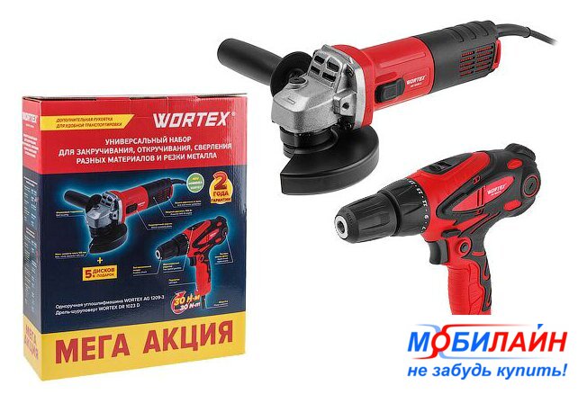 Комплектация | Дрель-шуруповерт WORTEX DR 1023 D - 1 шт.;Одноручная углошлифмашина WORTEX AG 1209-3 - 1 шт.;Отрезной круг WORTEX 125x1,2x22,2 мм - 5 шт. |