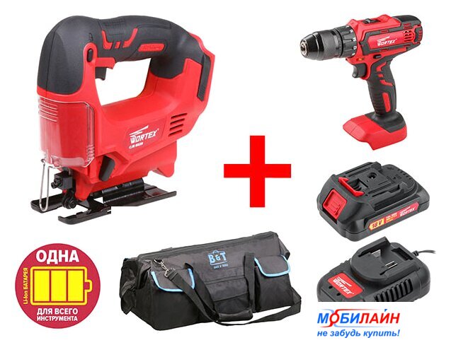 Комплектация | Электролобзик Wortex CJS 6529Дрель-шуруповерт Wortex BD 1825-1 DLiАккумулятор WORTEX CBL 1820 18.0 В, 2.0 А/ч, Li-Ion ALL1Зарядное устройство WORTEX FC 2120-1 ALL1Сумка для инструмента B&T BA 1301 |