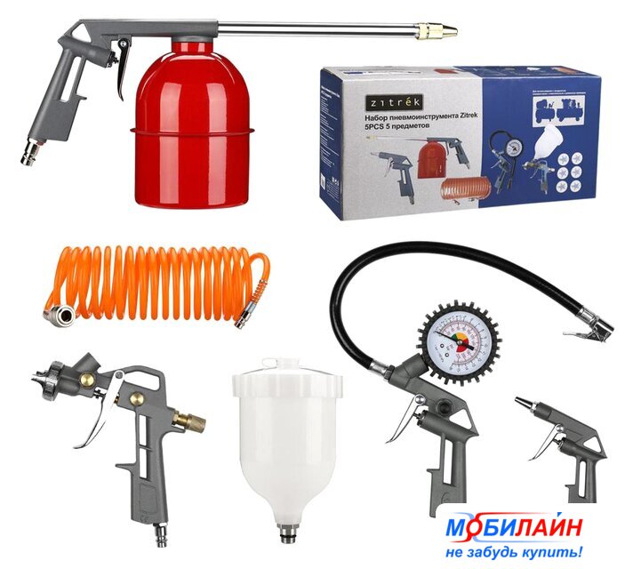Комплектация | Краскораспылитель Zitrek H-827 с верхним бачкомПистолет продувочный Zitrek DG-10B-1.Пистолет для накачки с манометром Zitrek TG-61Пистолет для вязких жидкостей Zitrek 8036bШланг спиральный Zitrek 5*8* 5м. РЕ. |