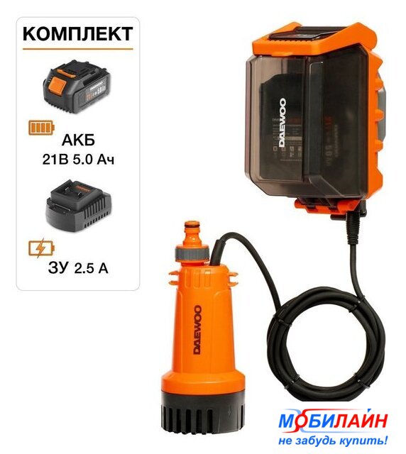 Комплектация | - Насос;- Аккумулятор DABT 5021Li;- Зарядное устройство DACH 2521Li;- Адаптер для быстросъемного коннектора;- Крепление на стену;- Крюк для фиксации со шлангом;- Инструкция по эксплуатации;- Гарантийный талон.Товар совместим со всеми аккумуляторными батареями и зарядными устройствами DAEWOO линейки 21В |