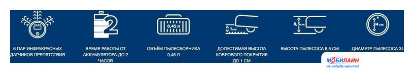влажная уборка, сила всасывания 350 Па, пылесборник 0.2 л, навигация: контактный бампер, датчики перепада высоты