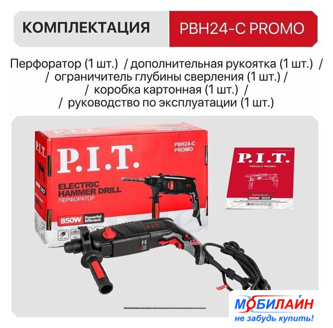 Комплект поставки | - Перфоратор, - ограничитель глубины сверления, - дополнительная рукоятка, - коробка, - руководство по эксплуатации. |