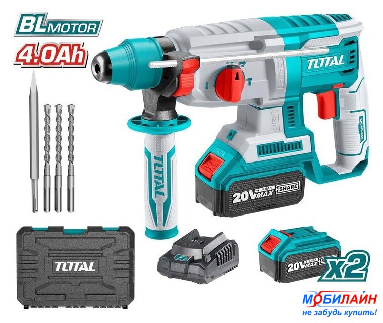 | Комплект поставки | - Перфоратор;- Дополнителная рукоятка;- Ограничитель глубины;- Аккумулятор 4,0 Ач - 2 шт.- Быстрое интеллектуальное зарядное устройство - 1 шт.- Буры 6x150, 8x150,10x150 мм. - 3 шт.- Долото - 1 шт.- Кейс. |