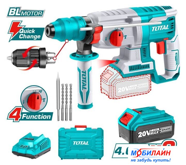 | Комплект поставки | Перфоратор - 1 шт.Съемный сверлильный патрон - 1 шт.Дополнителная рукоятка - 1 шт.Ограничитель глубины - 1 шт.Аккумулятор TFBLI2002 4,0 Ач - 2 шт.Быстрое интеллектуальное зарядное устройство TFCLI2001E - 1 шт.Буры 6x150, 8x150,10x150 мм. - 3 шт.Долото - 1 шт.Кейс |
