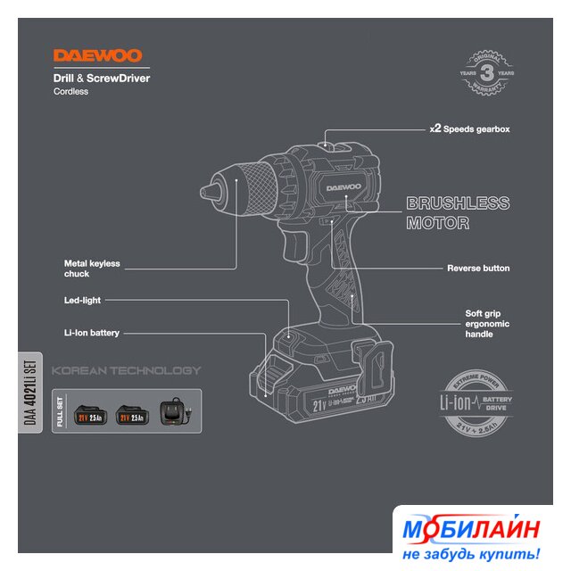 Комплектация | - Дрель-шуруповерт - 1 шт.- Аккумулятор 2,5 Ач - 2 шт.- Зарядное устройство - 1 шт.- Скоба для крепления - 1 шт.- Инструкция- Кейс |