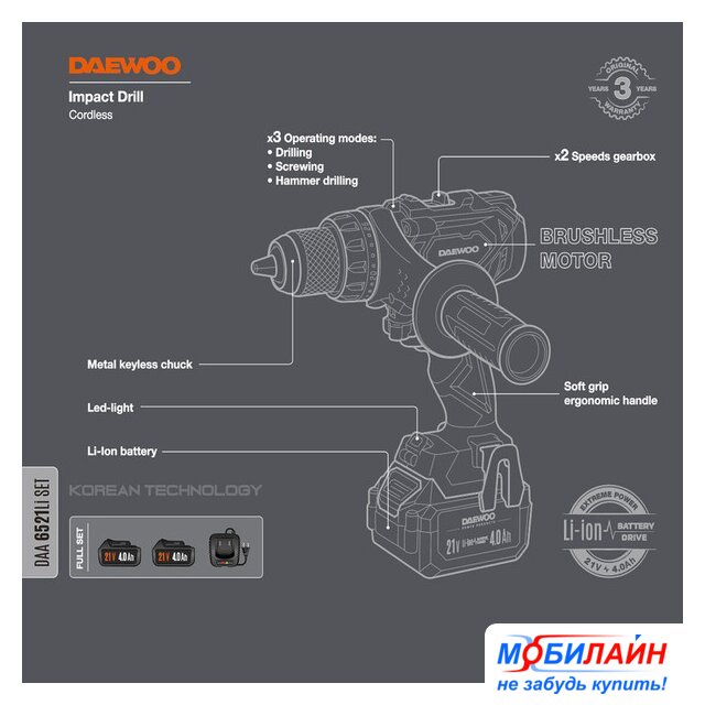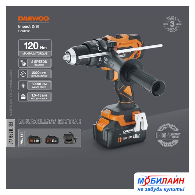 Комплектация | - Дрель-шуруповерт - 1 шт.- Аккумулятор 4,0 Ач - 2 шт.- Зарядное устройство - 1 шт.- Дополнительная рукоятка - 1 шт.- Скоба для крепления - 1 шт.- Инструкция- Кейс |