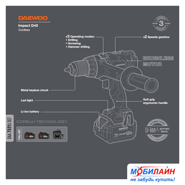 Комплектация | - Дрель-шуруповерт - 1 шт.- Аккумулятор 4,0 Ач - 1 шт.- Аккумулятор 5,0 Ач - 1 шт.- Зарядное устройство - 1 шт.- Дополнительная рукоятка - 1 шт.- Скоба для крепления - 1 шт.- Инструкция- Кейс |