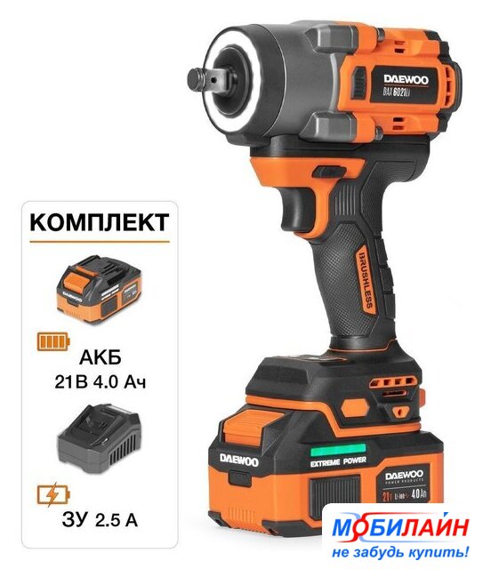 Комплектация | - Гайковерт - 1 шт.- Аккумулятор 4,0 Ач - 1 шт.- Зарядное устройство - 1 шт.- Торцевые головки (17, 19, 21 мм) - 3 шт.- Инструкция- Кейс |