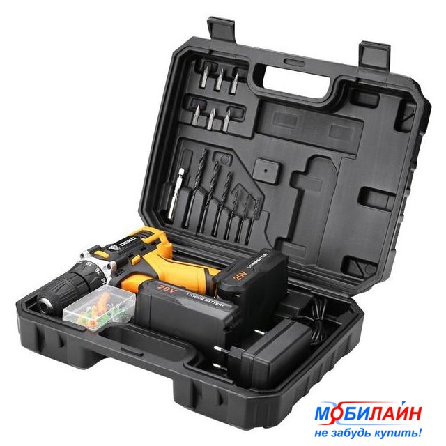 Комплектация | - Дрель-шуруповерт;- Аккумулятор - 2 ш;- Зарядное устройство;- Инструкция;- Кейс;Поставляется с набором в 63 предмета:Биты - 6 шт;Сверла - 6 шт;Удлинитель бит - 1 шт;Набор крепежа - 50 шт. |